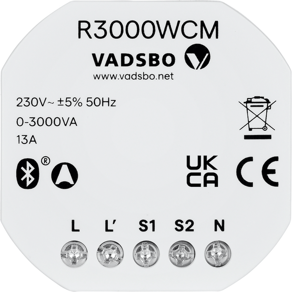 Der VADSBO R3000WCM ist ein Casambi-Modul mit gleich zwei Funktionen: Zum Einen ist er ein Relais für den Anschluss von Lasten bis zu 13A und zum Anderen erlaubt er den Anschluss von bis zu 2 Tastern. Diese beiden Funktionen können auch getrennt genutzt werden - die angeschlossenen Taster können jeder anderen Casmabi Leuchte / Gruppe / Szene zugeordnet werden für deren Schaltung und Dimmung! Das Relais eignet sich durch seine hohe Last von 13A für den Anschluss von starken Beleuchtungsanlagen die nicht dimmbar sind oder auch für den Anschluss von anderen elektrischen Geräten zur Schaltung: Ob zum Anschalten des Kaffeevollautomats oder zur Schaltung des Springbrunnens im Garten - der Kreativität sind keine Grenzen gesetzt außer die 13A Maximal-Last.