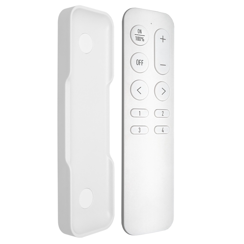 Die CPRESS Fernbedienung ist eine kabellose Fernbedienung für das Casambi-Bluetooth-System. Sie bietet durch eine Vielzahl an durchdachten Tasten umfangreiche Steuerungsfunktionen: 4 Nummern-Tasten erlauben die Steuerung von 4 verschiedenen Casambi-Leuchten /-Szenen /-Gruppen. Eine Plus/Minus-Doppeltaste erlaubt die Helligkeitssteuerung. Zwei Pfeiltasten ermöglichen die Farbtemperatur-Steuerung von Tunable-White Casambi Leuchten/Szenen/Gruppen. Eine ON-Taste schaltet das gesamte Licht AN mit 100% Helligkeit udn eine OFF-Taste lässt das gesamte Licht ausschalten. Ausgestattet ist die CPRESS mit einer austauschbaren CR2032 Batterie. Die CPRESS kommt mit passender Wandhalterung in welcher die Fernbedienung magnetisch gehalten wird. Das Gehäuse und die Wandhalterung der CPRESS sind weiß-matt.